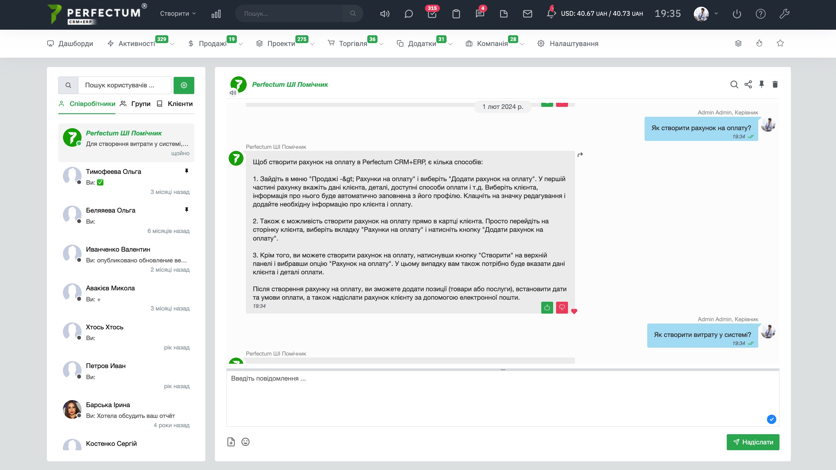 Після активації у вас додасться діалог у внутрішньому чаті співробітників "Perfectum ШІ помічник".