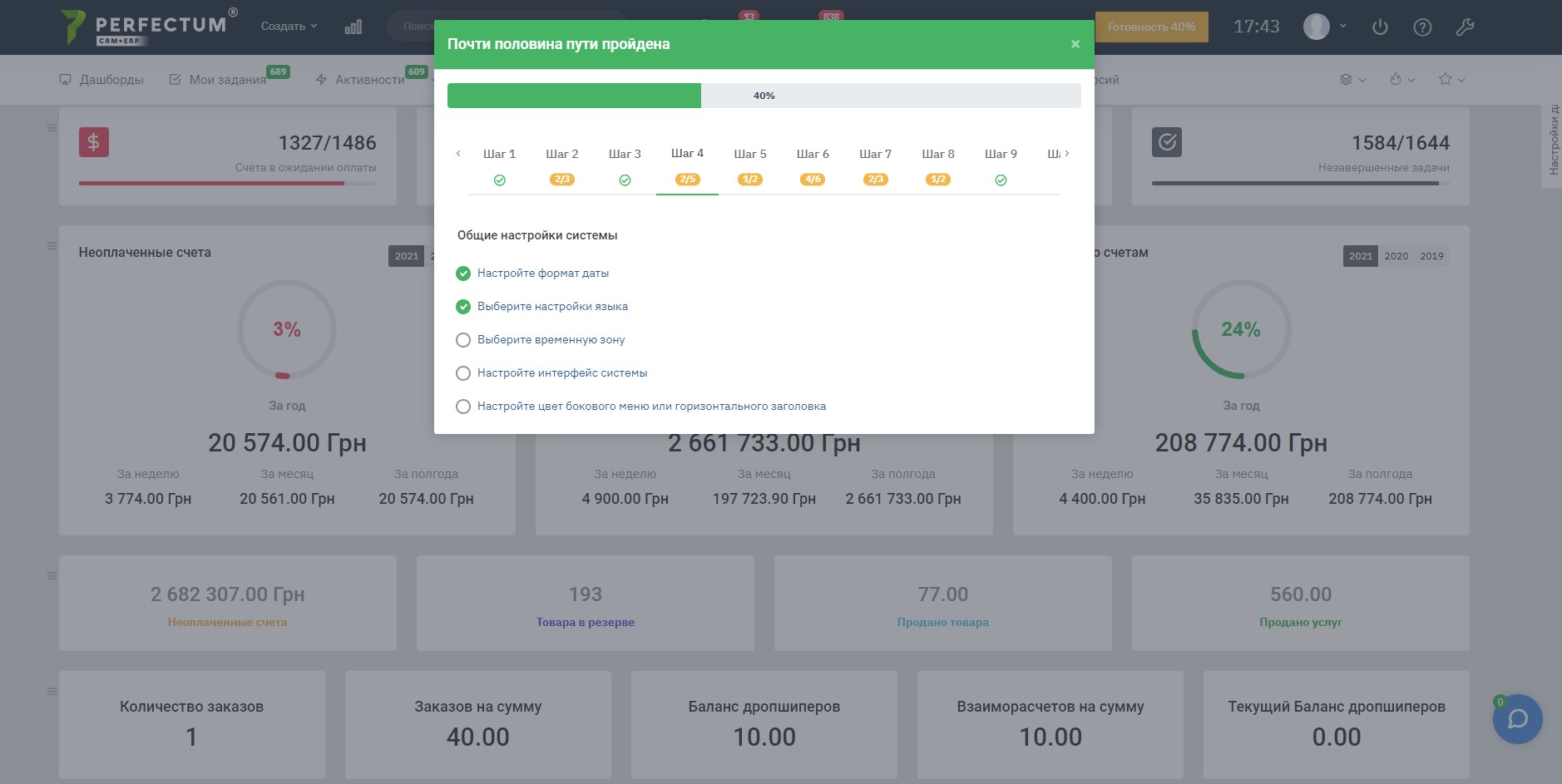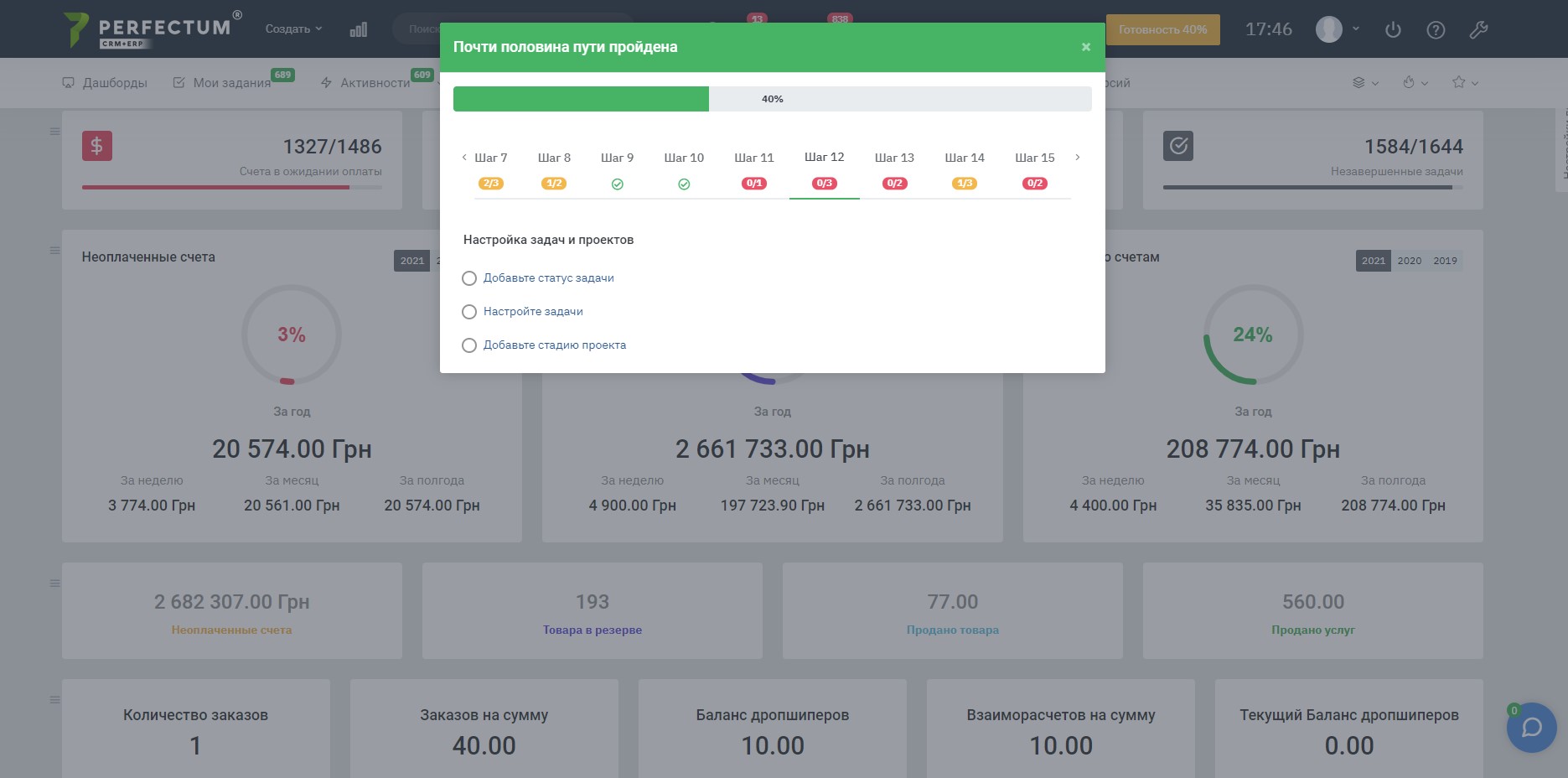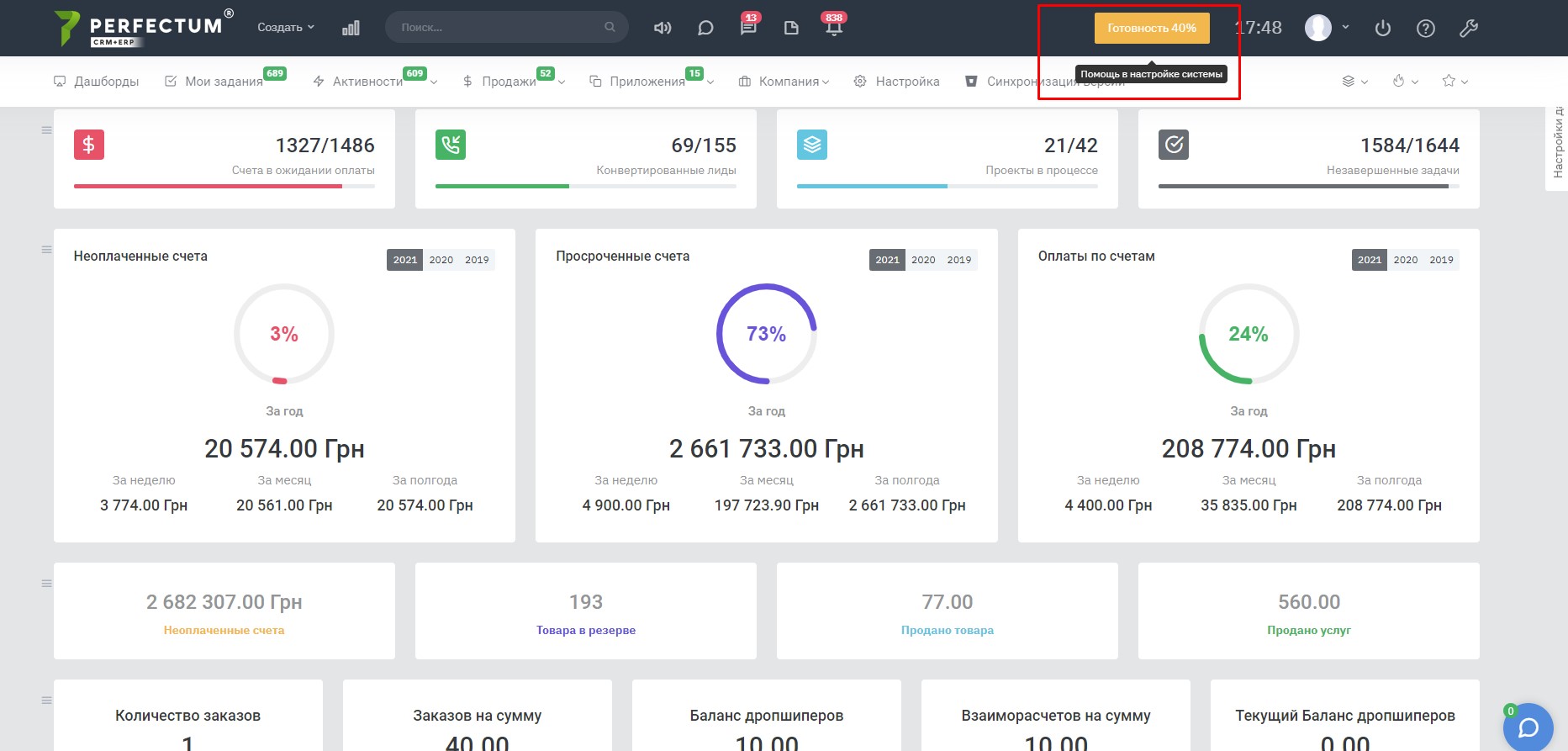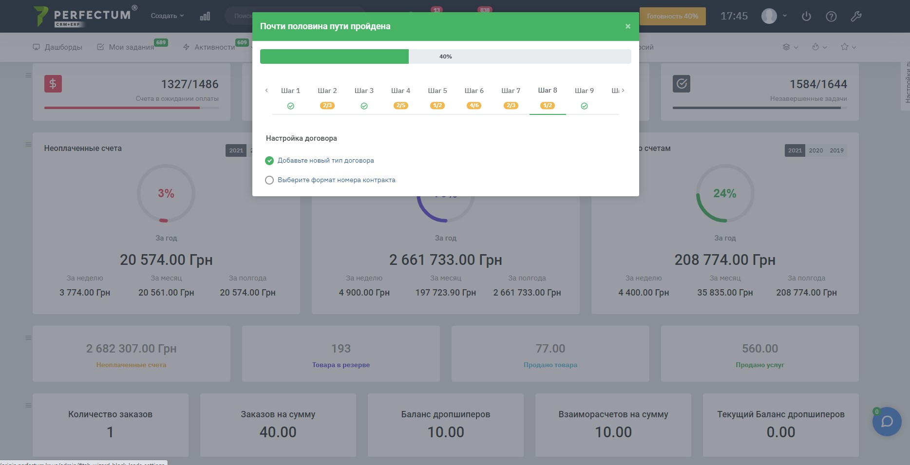 Після придбання системи Perfectum CRM + ERP, Вам необхідно налаштувати Вашу систему.  В цьому Вам допоможе спеціальний модуль "Візард". Візард - унікальний засіб, створений командою Perfectum CRM + ERP, який спрощує стандартне налаштування загального функціоналу системи.  Візард допоможе Вам покроково налаштувати систему для повноцінної роботи.  Просто натисніть на "Візард" і виконуйте покроково натисканням на завдання.