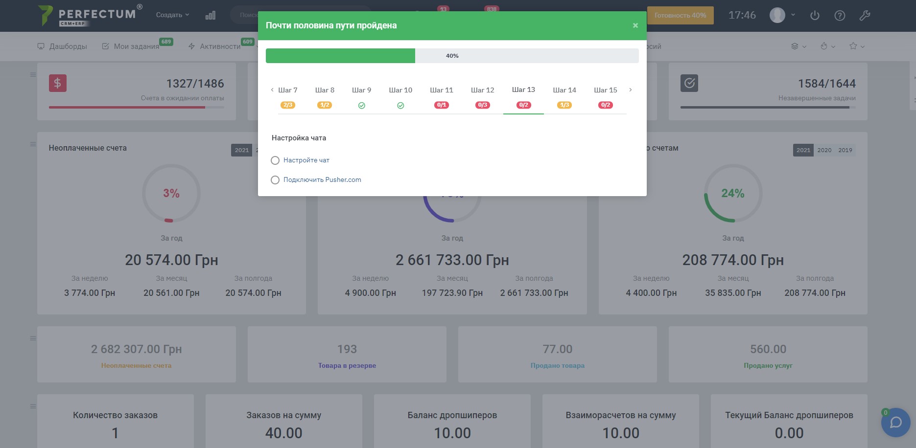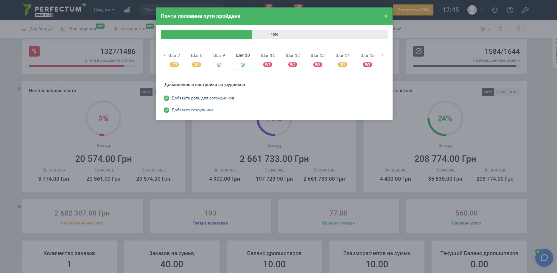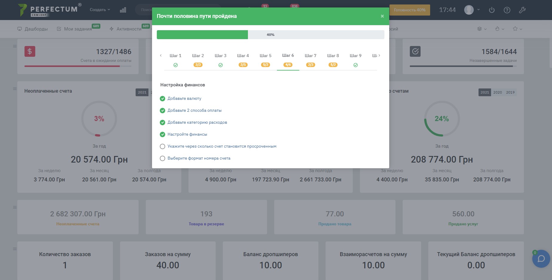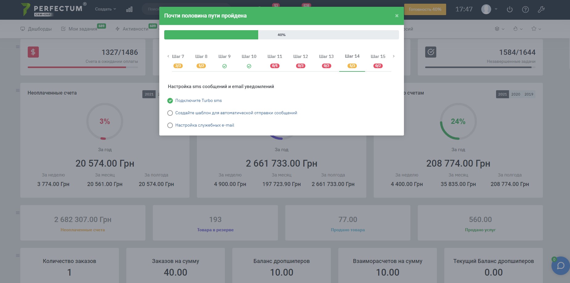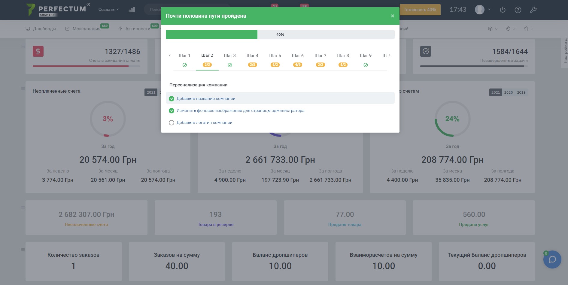 Після придбання системи Perfectum CRM + ERP, Вам необхідно налаштувати Вашу систему.  В цьому Вам допоможе спеціальний модуль "Візард". Візард - унікальний засіб, створений командою Perfectum CRM + ERP, який спрощує стандартне налаштування загального функціоналу системи.  Візард допоможе Вам покроково налаштувати систему для повноцінної роботи.  Просто натисніть на "Візард" і виконуйте покроково натисканням на завдання.