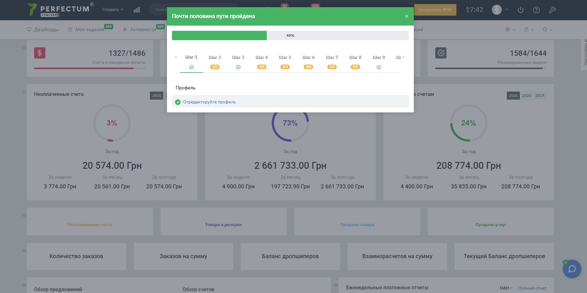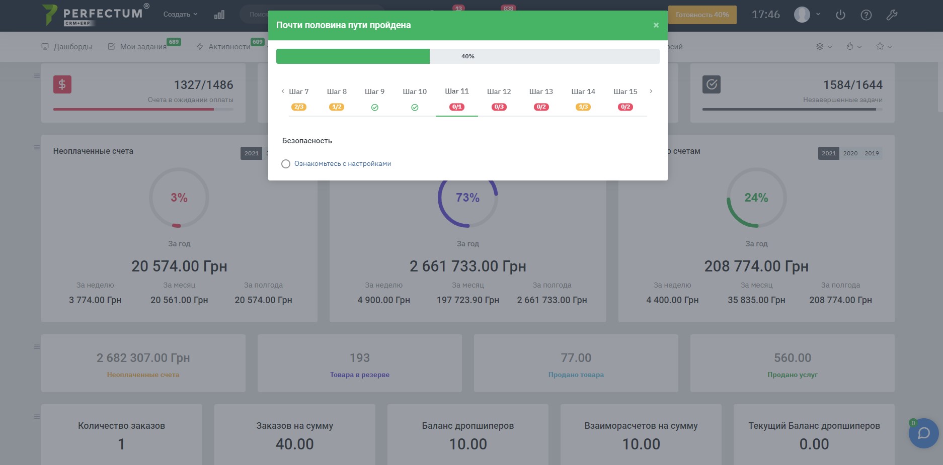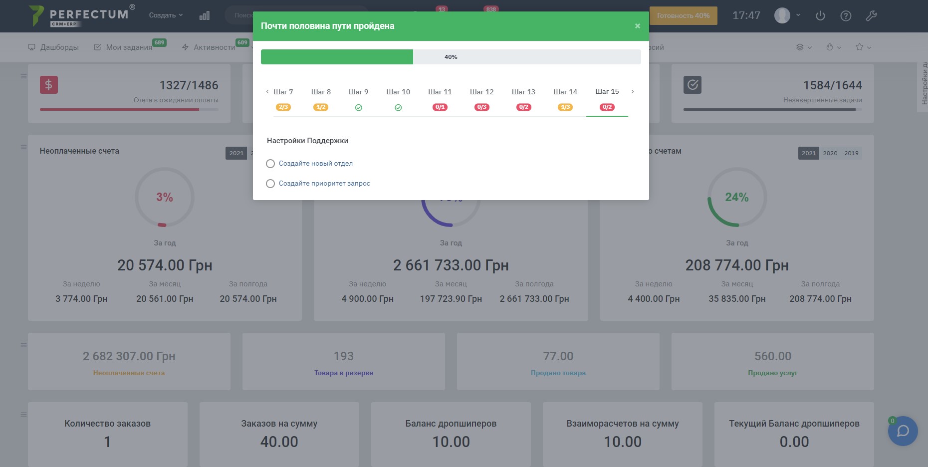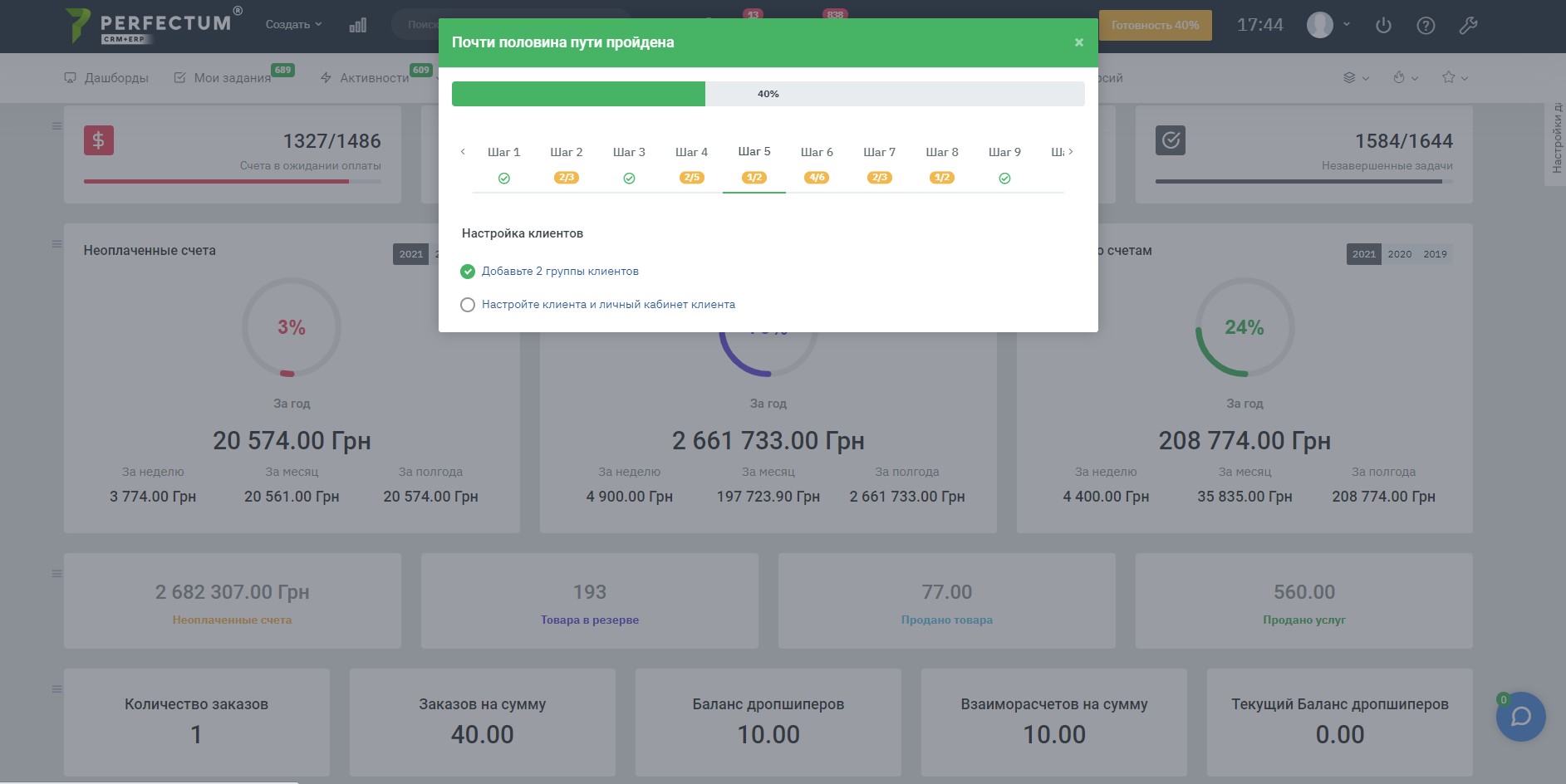 Після придбання системи Perfectum CRM + ERP, Вам необхідно налаштувати Вашу систему.  В цьому Вам допоможе спеціальний модуль "Візард". Візард - унікальний засіб, створений командою Perfectum CRM + ERP, який спрощує стандартне налаштування загального функціоналу системи.  Візард допоможе Вам покроково налаштувати систему для повноцінної роботи.  Просто натисніть на "Візард" і виконуйте покроково натисканням на завдання.